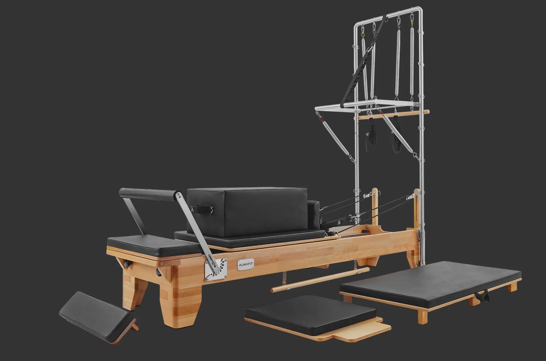 Durable wooden Pilates machine with built-in tower, perfect for home or studio use. Its sleek design and integrated tower offer a versatile workout solution that fits effortlessly into any space. Crafted to support your entire Pilates journey, enhancing core strength, flexibility, balance, mobility, and overall endurance in one complete package.